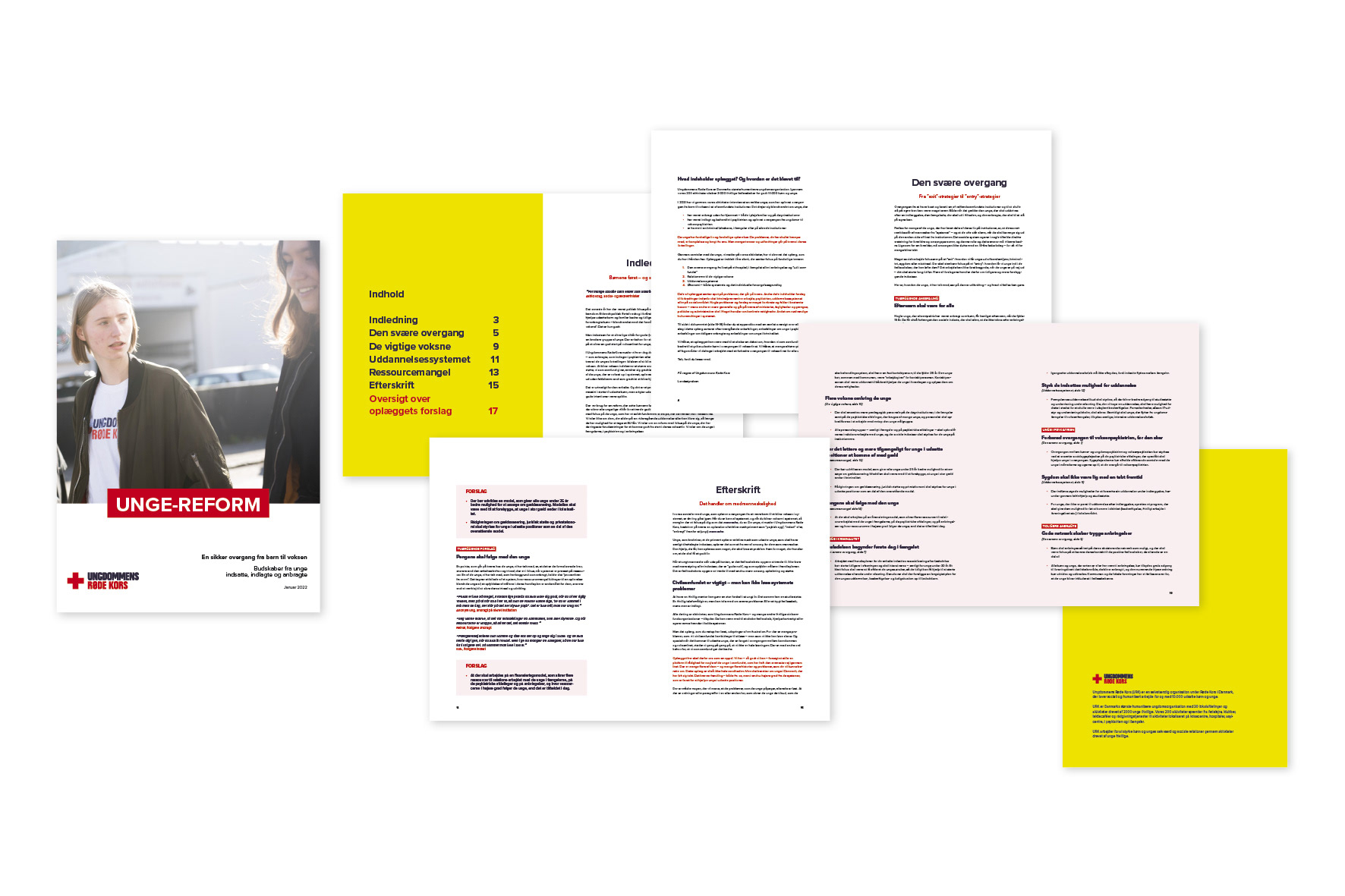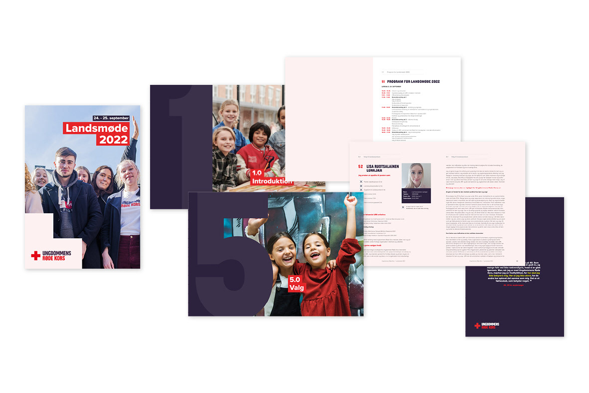 Ungdommens Røde Kors gør en stor indsats for at oplyse om og reagere på de udfordringer, som udsatte børn og unge står over for. Jeg har løst flere opgaver for organisationen – her ses eksempler fra landsmødemappen til deres årsmøde. og rapporten Unge-reform. Den visuelle identitet er ung, dynamisk og veldesignet – og derfor nem og inspirerende at arbejde videre med.